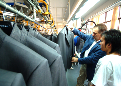 運(yùn)用高品質(zhì)的德國(guó)BRISAY立模整燙機(jī),采用電腦控制蒸汽輸出量、溫度、壓力、定型、抽濕時(shí)間,根據(jù)面料的厚薄、質(zhì)地、性能,以38種不同整燙程序調(diào)整以上各個(gè)參數(shù),配合服裝的整燙。